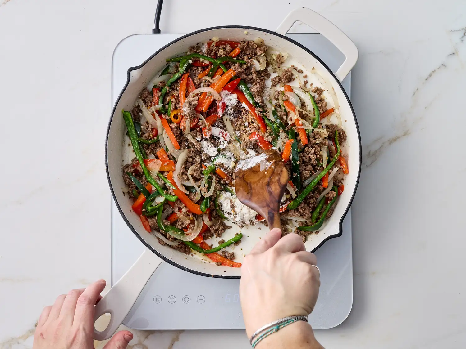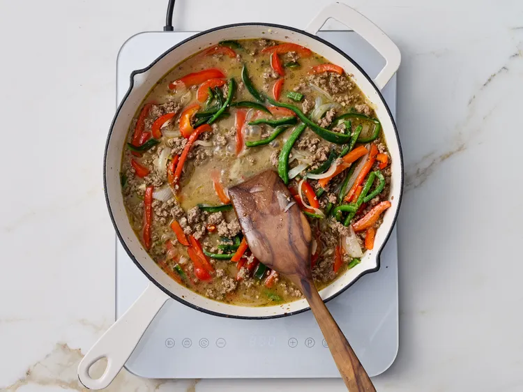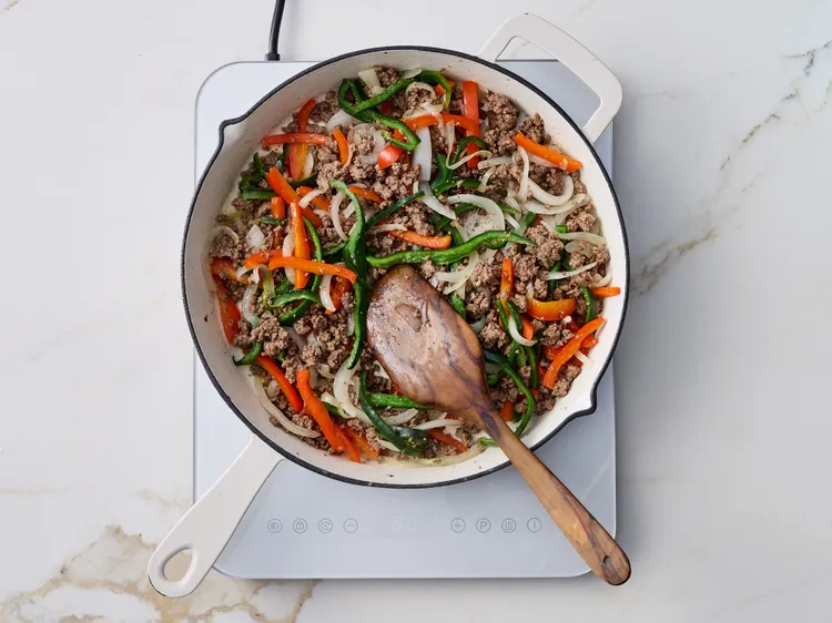 Step 3Meanwhile, heat 1 tablespoon of the oil in a 12-inch skillet over medium heat. Add ground beef, and cook for 4 minutes. Add peppers and onions. Cook until beef is browned and vegetables are tender, about 8 minutes.
