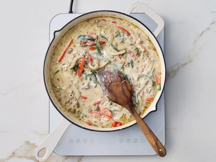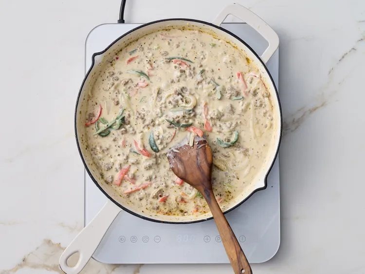 Step 6 Add cream cheese to the skillet. Cook and stir until melted.
