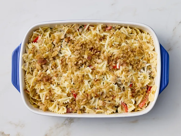 Step 9Toss bread crumbs with remaining 2 tablespoons olive oil in a small bowl to coat. Spread over the mixture.